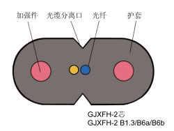 GJXFH非金屬加強(qiáng)件、低煙無鹵阻燃聚烯烴護(hù)套、蝶形引入光纜
