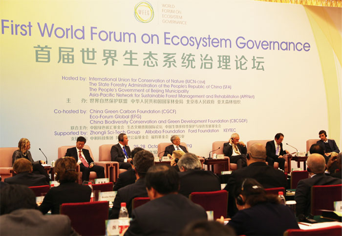 10月25日,由世界自然保護聯(lián)盟(IUCN)、中國國家林業(yè)局、北京市政府和亞太森林組織共同主辦的“首屆生態(tài)系統(tǒng)治理論壇”在人民大會堂拉開了帷幕。政府代表、學(xué)術(shù)專家、國內(nèi)外非政府組織代表、私營部門代表,以及當?shù)厣鐓^(qū)代表近三百人,齊聚一堂,共同關(guān)注并探討生態(tài)系統(tǒng)治理這個全球性問題。國家林業(yè)局局長張建龍、IUCN主席章新勝、總干事英格?安德森(Inger Andersen)、北京市副市長林克慶、亞太森林組織董事會主席趙樹叢和聯(lián)合國森林論壇秘書長米諾?索伯拉(ManoelSobralFilho),出席本次論壇開幕式并致辭。