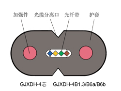 | GYXDH | 金屬加強(qiáng)件、低煙無(wú)鹵阻燃聚烯烴護(hù)套、蝶形引入光纖帶光纜 | |
