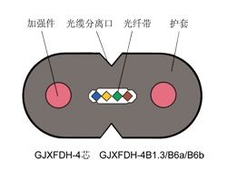 | GJXFDH | 非金屬加強(qiáng)件、低煙無(wú)鹵阻燃聚烯烴護(hù)套、蝶形引入光纖帶光纜 | |